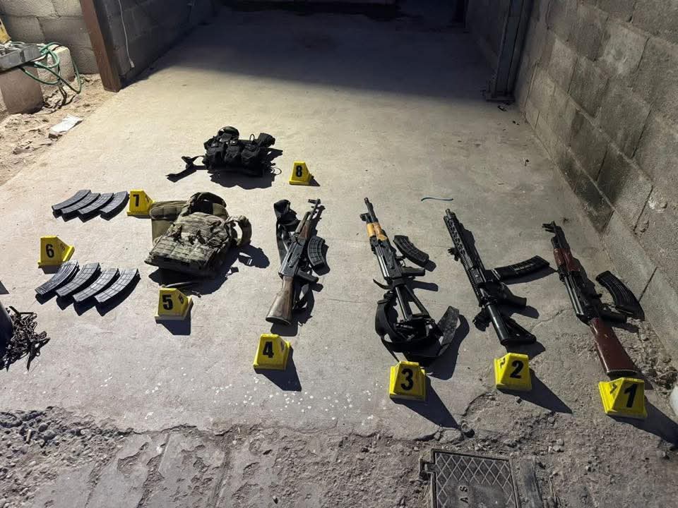 Durante la intervención, los masculinos intentaron escapar a través de los techos aledaños, sin embargo se logró su captura, asegurando cuatro armas largas tipo fusil con sus respectivos cargadores, así como ocho cargadores adicionales y dos chalecos balísticos.