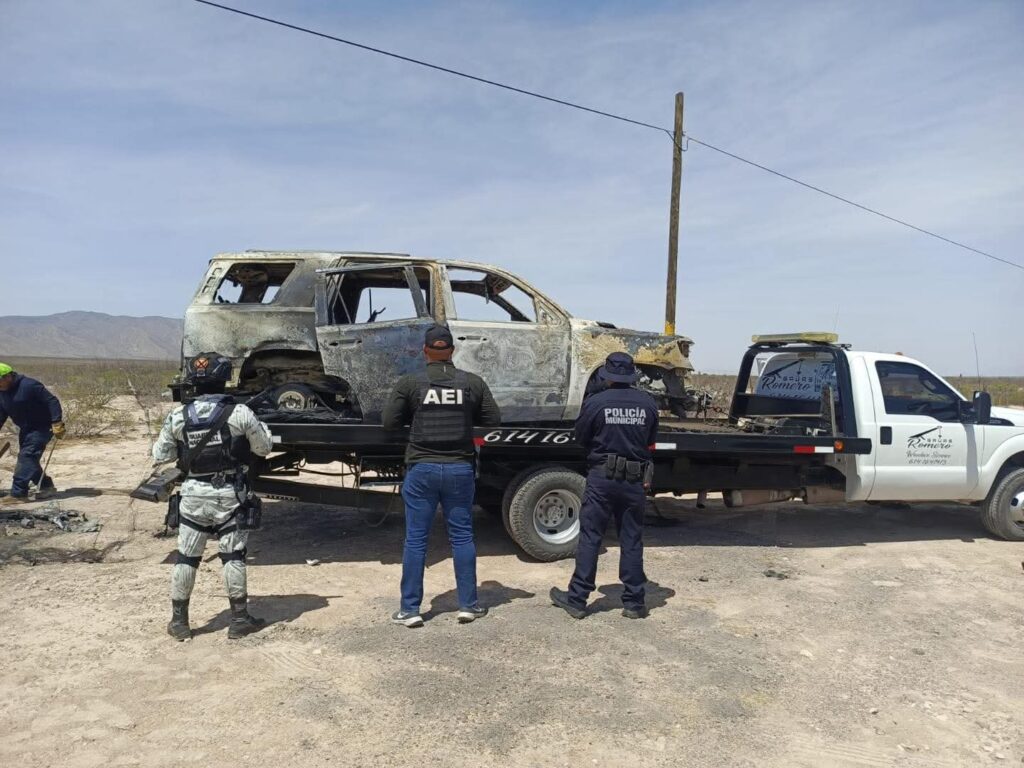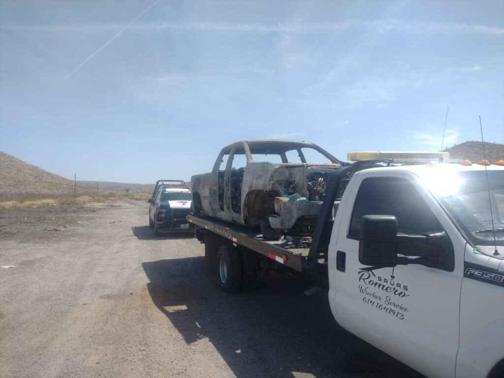 Este domingo, autoridades de los tres niveles de gobierno retiraron dos vehículos que permanecían incendiados a la orilla de la carretera Aldama a Ojinaga, cuatro kilómetros después del entronque a Chorreras.