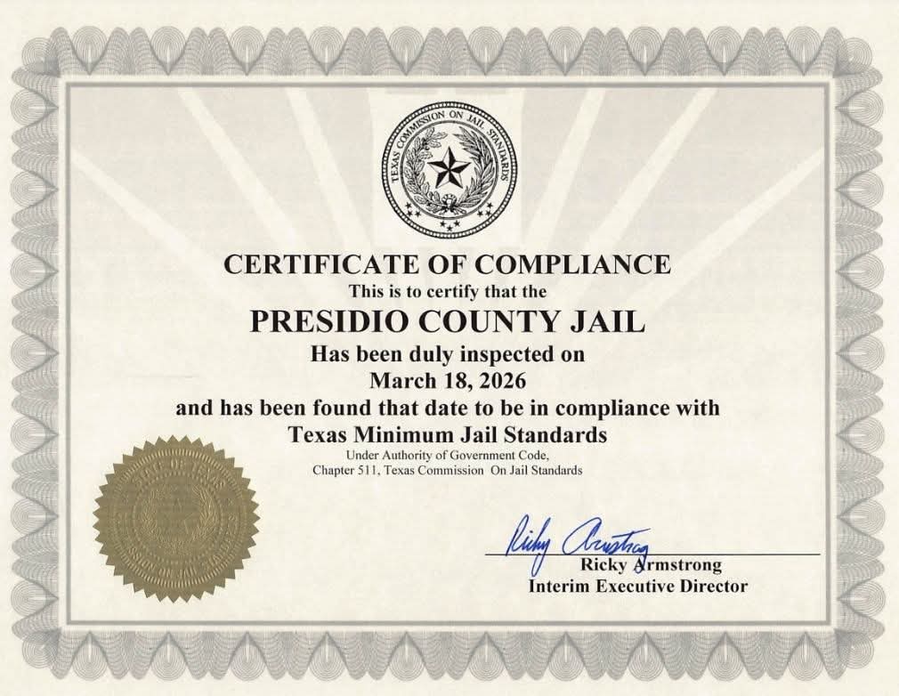 La cárcel del condado de Presidio acaba de recibir su certificado y se ha descubierto que cumple con las normas de la cárcel de Texas.