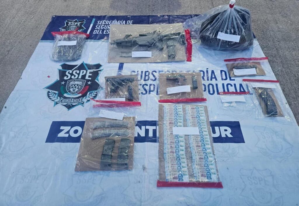 Tras efectuar la revisión correspondiente, los agentes aseguraron un arma larga, dos armas cortas, siete cargadores y 111 cartuchos útiles de distintos calibres, así como dos placas balísticas. Asimismo, se localizó un envoltorio plástico que contenía más de 2.1 kilogramos de presunta marihuana, además de una dosis de presunta cocaína.