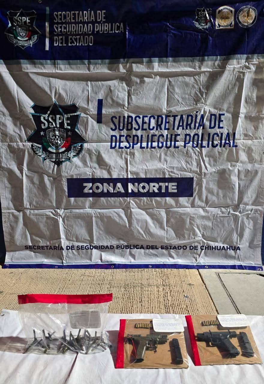 Elementos de la Policía de Despliegue de la Secretaría de Seguridad Pública del Estado (SSPE) realizaron la detención de Luis Enrique H. G. y Juan Manuel S. R., a quienes se les aseguraron dos armas de fuego, en el municipio de Ojinaga.
