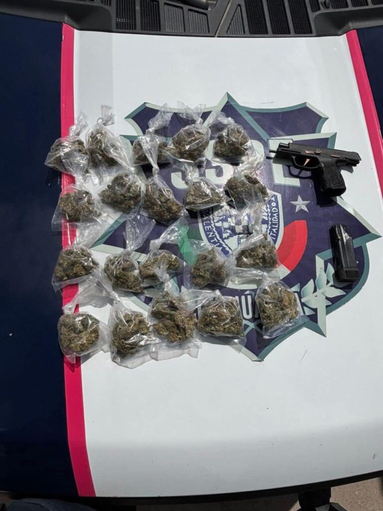 Durante la revisión, los elementos localizaron entre sus pertenencias un arma de fuego calibre 9 milímetros, equipada con un cargador abastecido con 8 cartuchos útiles, así como 20 envoltorios que contenían una sustancia con características propias de la marihuana.
