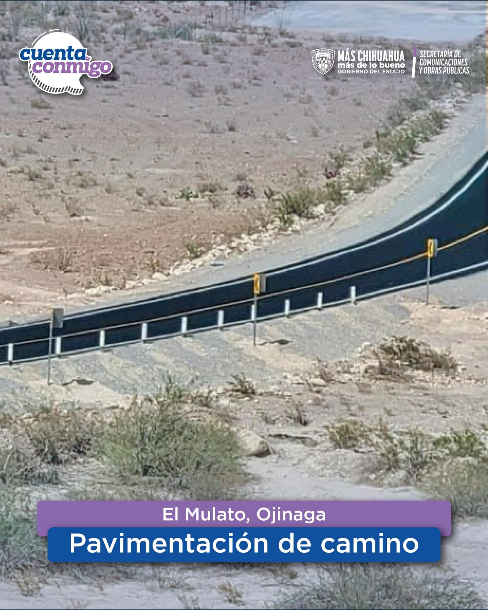 La autora de la obra, la Secretaría de Comunicaciones y Obras Públicas (SCOP) del Estado, informó que “el camino El Mulato en el municipio de Ojinaga ya cuenta con pavimentación, pintura y señalamiento”.