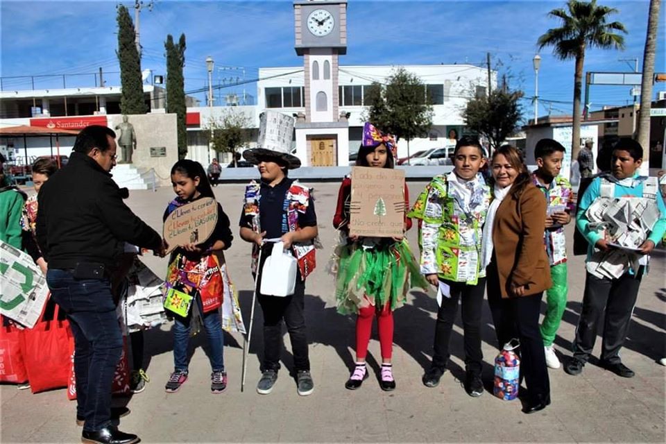 OJINAGA. -Un grupo de alumnos de la Escuela Primaria Toribio Ortega, luego de realizar una marcha por la Ave. Trasviña y Retes, visitan al Alcalde C. Martín Sánchez Valles para exponerle la importancia del reciclado, así como de incentivar una campaña de limpieza en la ciudad.